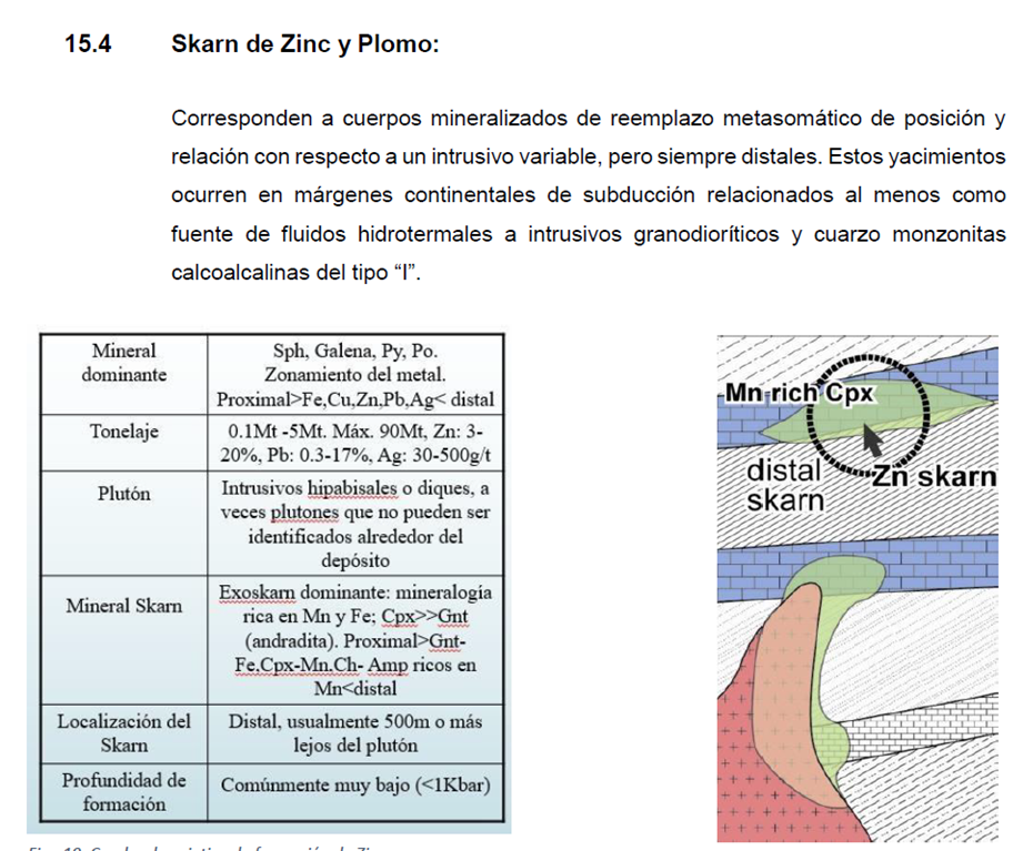 Corresponden a cuerpos mineralizados de reemplazo metasomático de posición y relación con respecto a un intrusivo variable, pero siempre distales. Estos yacimientos ocurren en márgenes continentales de subducción relacionados al menos como fuente de fluidos hidrotermales a intrusivos granodioríticos y cuarzo monzonitas calcoalcalinas del tipo “I”.